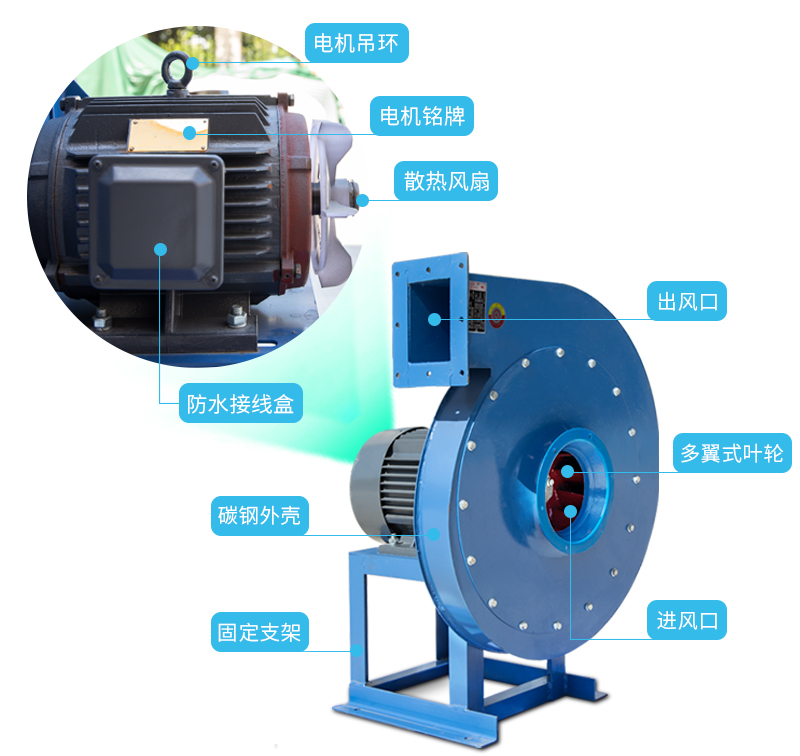 銅芯電機 起重吊環(huán) 多翼式葉輪 多角度出風(fēng)口 風(fēng)機銘牌